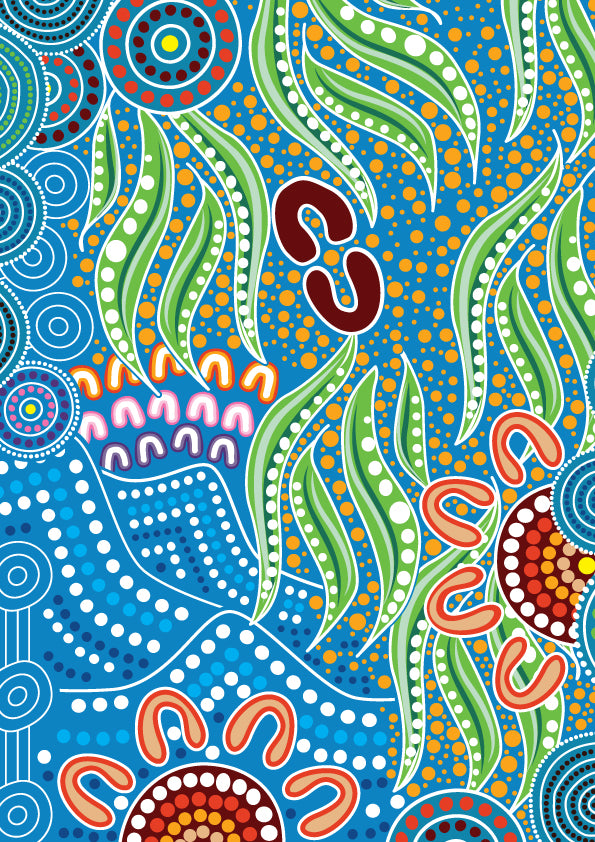 The painting features symbols that represent the various communities that have supported us throughout our journey. These elements weave together the narrative of resilience and connection, highlighting the importance of Gumby Gumby as a cornerstone of our heritage and its role in fostering well-being and unity among our people.